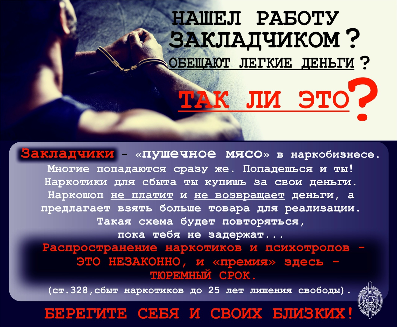 Наркобизнес сегодня безлик, жесток, беспринципен и беспощаден. Лица, попавшие в сети наркобизнеса через объявления в Интернете, становятся расходным материалом. Единственная цель нанимателей — это обогащение за счет судеб, жизней и здоровья молодых и наивных людей.